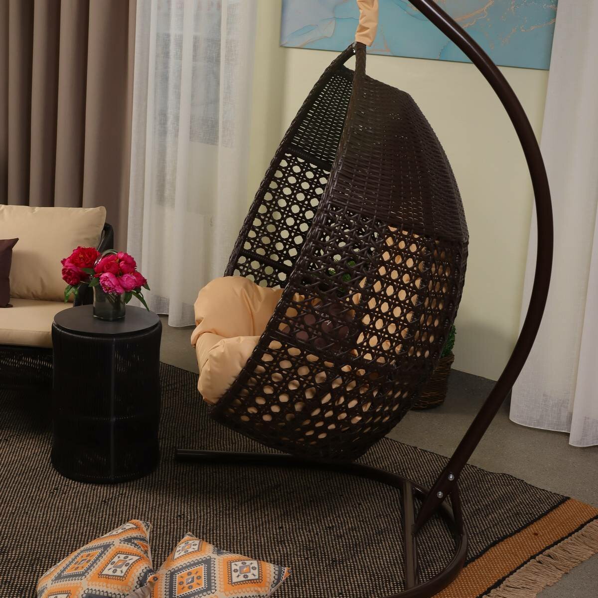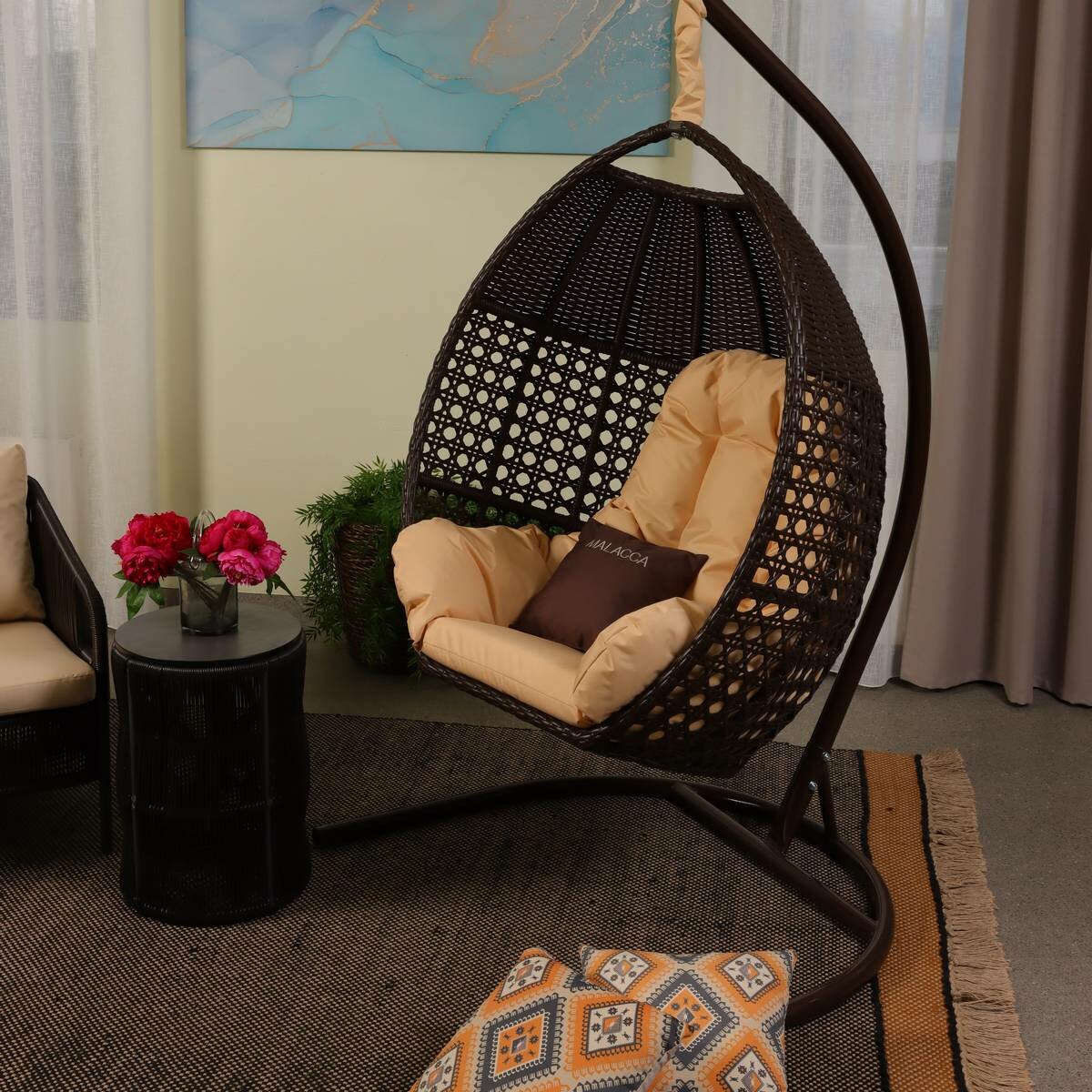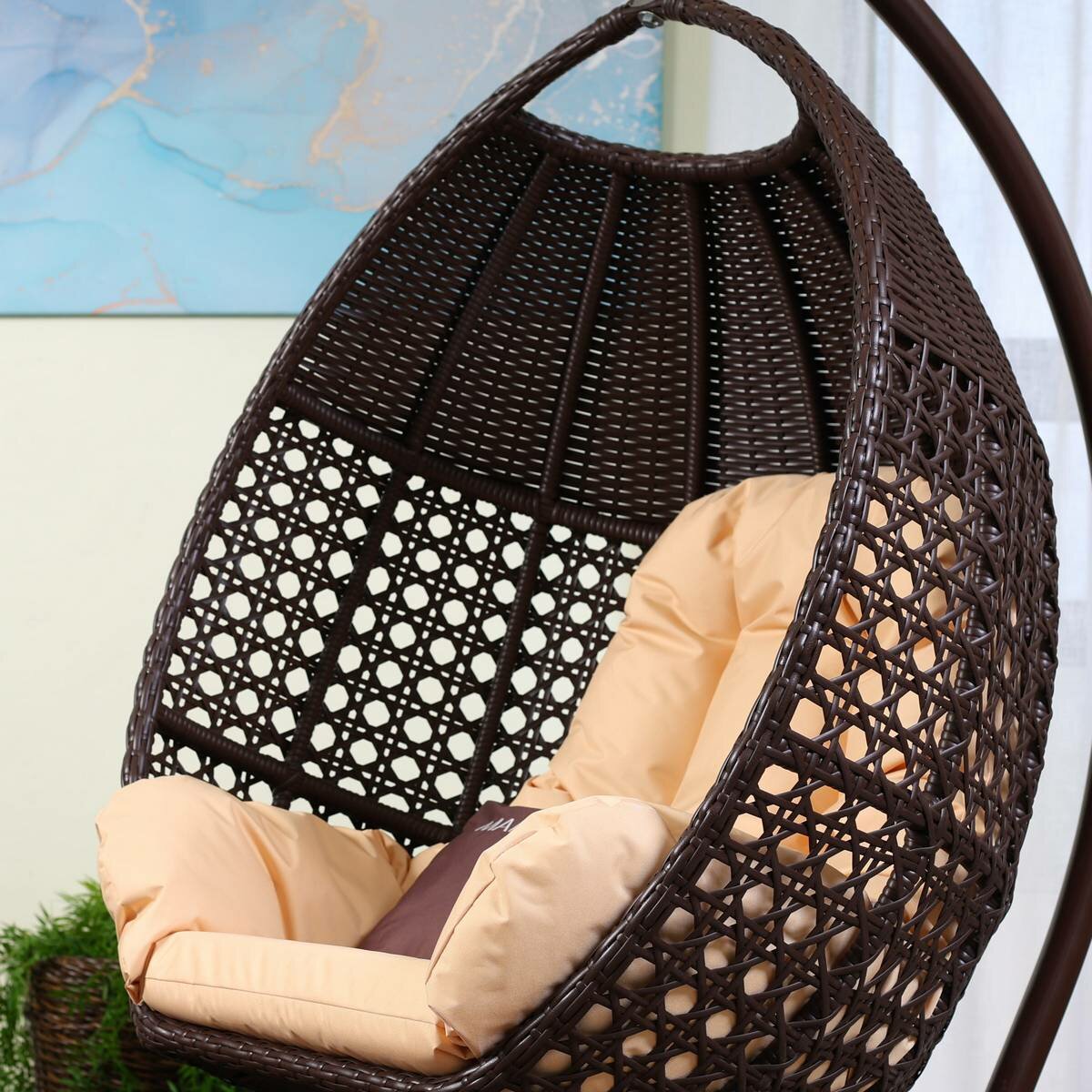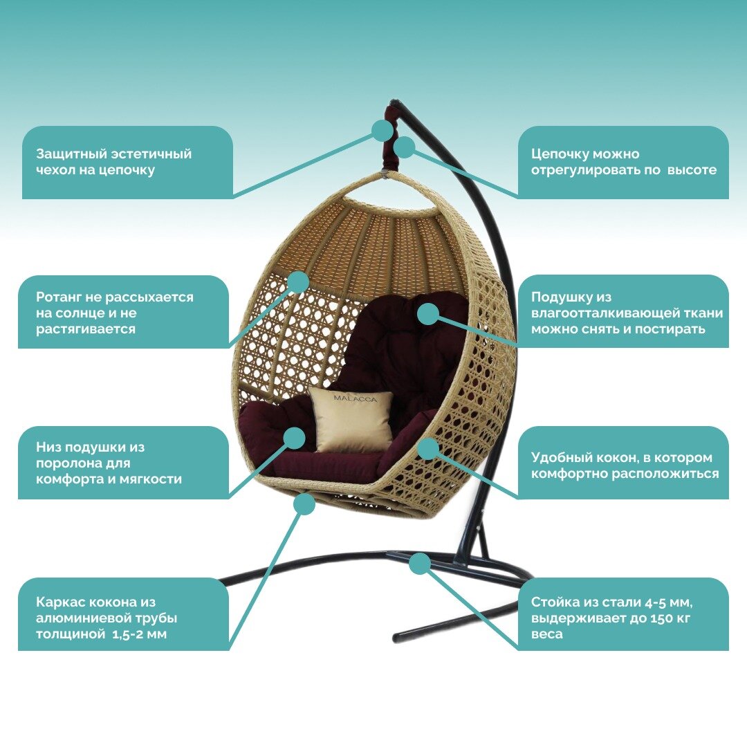 Высокопрочное, супер устойчивое кресло с прочным качественным плетением ручной работы. Стойка из стали, выдерживает до 150 кг, безопасно для детей! Производство полностью Россия. Подвесное кресло из ротанга Авиано с мягкой подушкой — уютное место для отдыха после рабочего дня в саду загородного дома или в гостиной и спальной комнате городской квартиры. Качаясь в коконе можно почитать книжку или посмотреть сериал. Качели из ротанга станут любимым пространством для ребенка в детской комнате. Нет ничего лучше качаться дома на качелях с игрушками в обнимку.