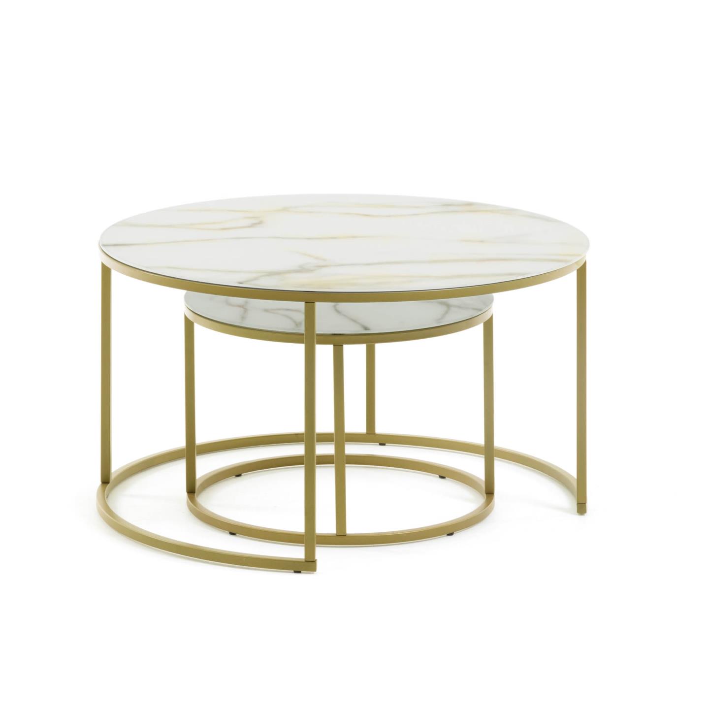 Набор из 2 приставных столиков Leonor Ø 80 см / Ø 50 см от фабрики La Forma – уникальная двухслойная столешница на утонченном металлическом основании. Сет из двух столиков Leonor – это гармоничные изделия, которые не только дополняют друг друга, но и способны существенно преобразить интерьер. Ведь благодаря их круглой форме и разной высоте, можно постоянно экспериментировать с их расстановкой. А столешница мраморного цвета, спрятанная под прозрачное стекло, создает удивительный эффект глянца и добавляет изделиям практичности и эргономики. Оцените превосходство этих моделей! Столики круглой формы. Столешницы двухслойные – отделка под мрамор сверху покрыта закаленным прозрачным стеклом. Толщина стекла – 6 мм. Опора металлическая, с матовым латунным напылением. Она имеет сварную структуру, состоящую из двух колец (основание и опора под стеклом) и четырех ножек в виде квадратных трубок с шириной грани 1,6 см. Снизу у основания есть четыре пластиковые накладки, которые защищают напольное покрытие от повреждений. Суммарная нагрузка на столики не должна превышать 25 кг. Размеры: ширина – 80 и 50 см, высота – 46 и 36 см. Вес – 15,4 кг. Для сборки в комплектацию включена инструкция и крепеж.