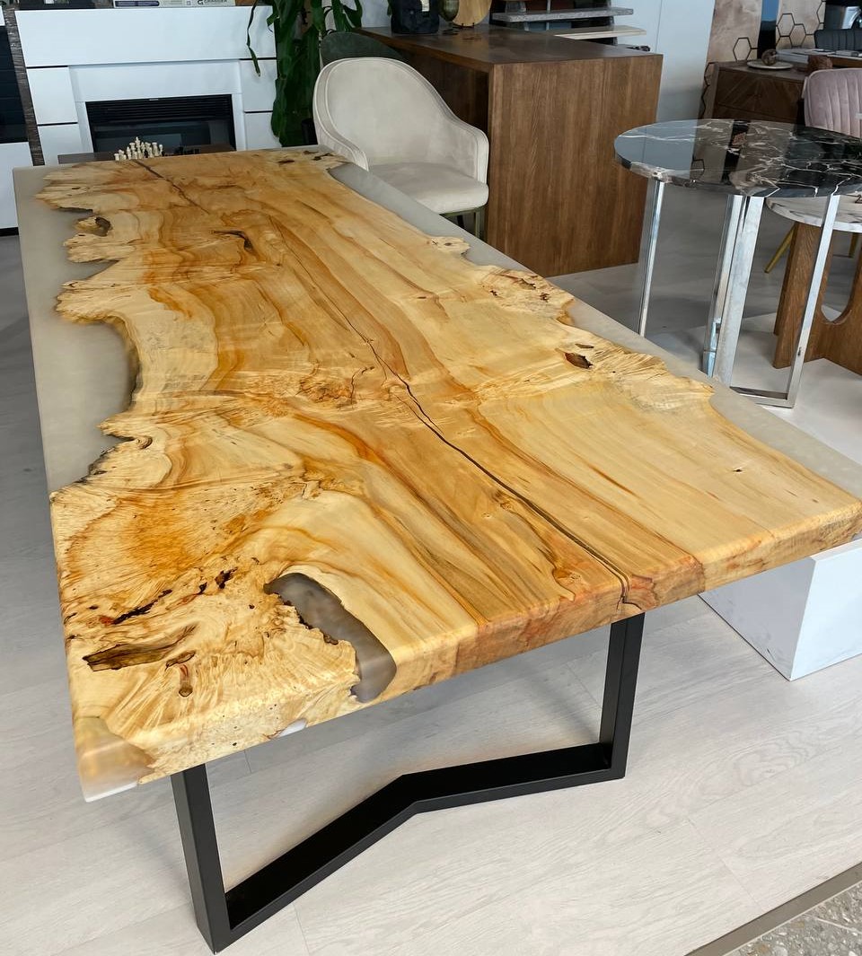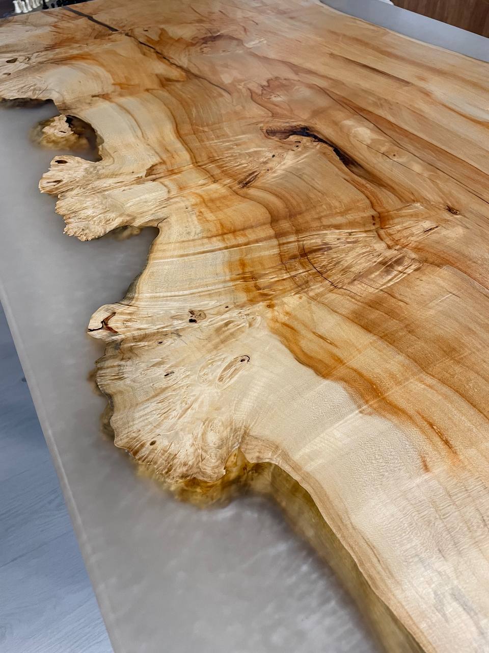 Большой мощный стол из слэба клена и эпоксидной смолы по краям.