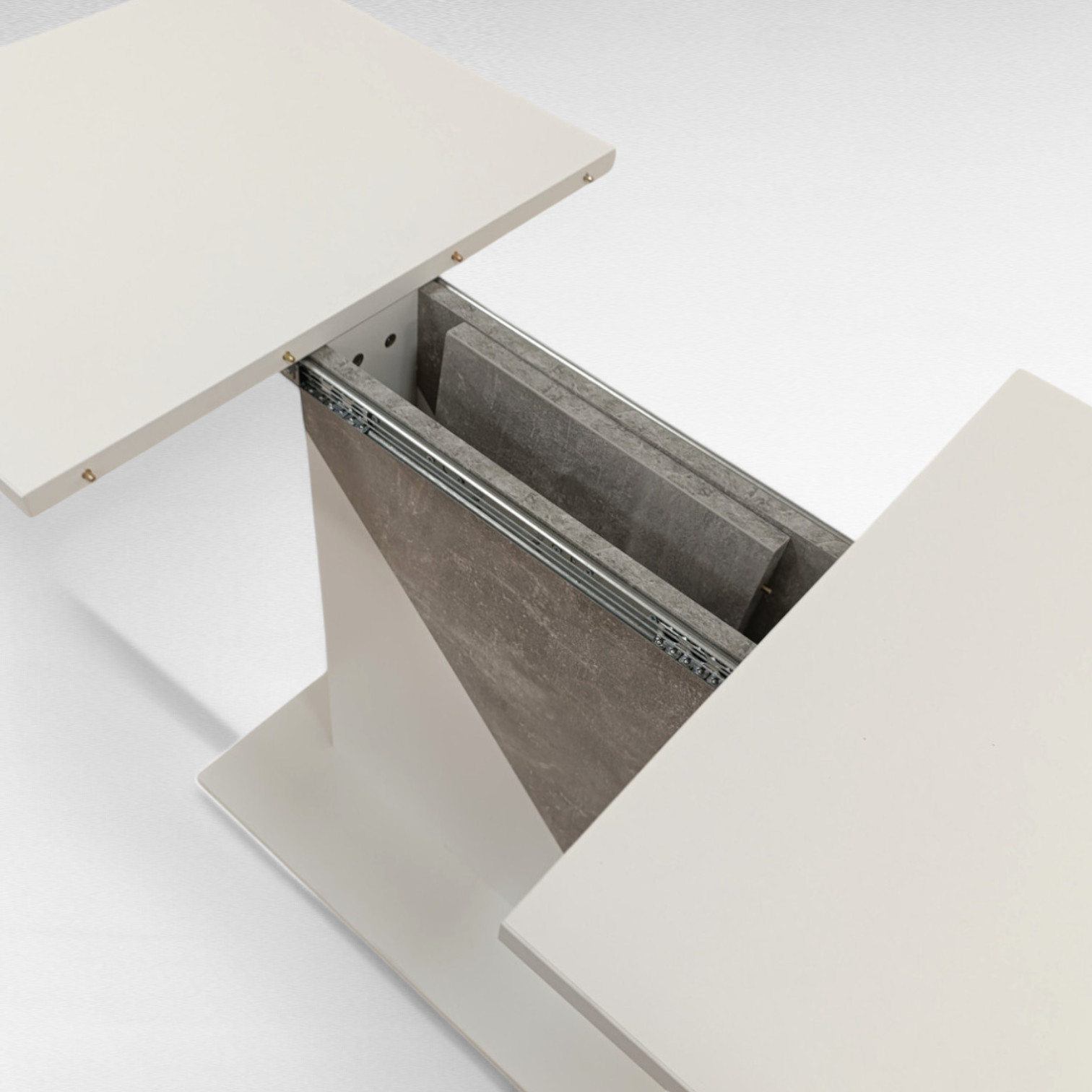 Стол можно легко разложить до размера 145 см., благодаря синхронному механизму, две половинки столешницы раздвигаются одновременно. Вставка стола уютно храниться внутри стола и не займет лишнего места.
