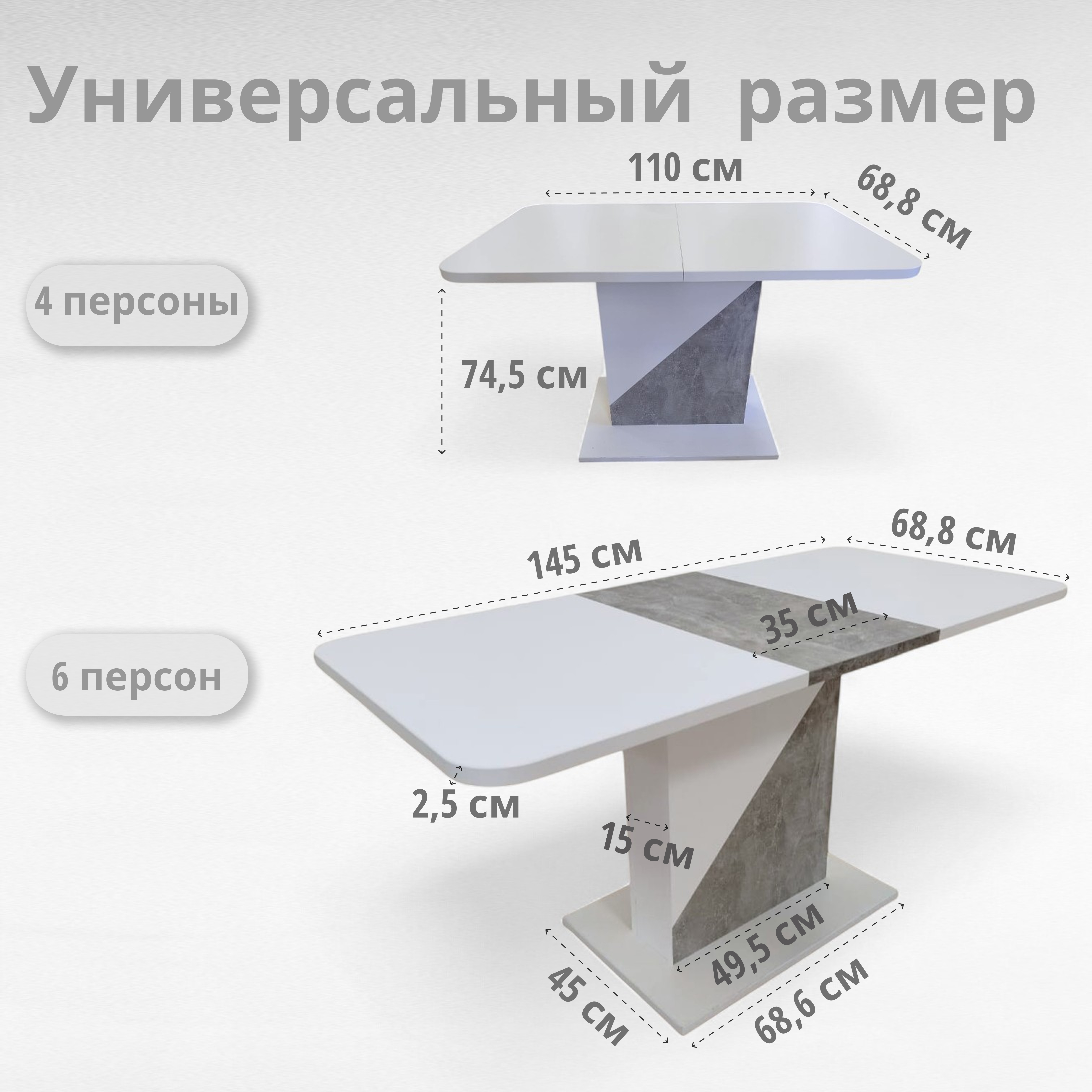 Ширина раскладного стола ACCENT в собранном виде составляет 110 см, высота - 74,5 см, а глубина - 68,5 см, что делает его идеальным выбором для небольшой кухни, гостиной.