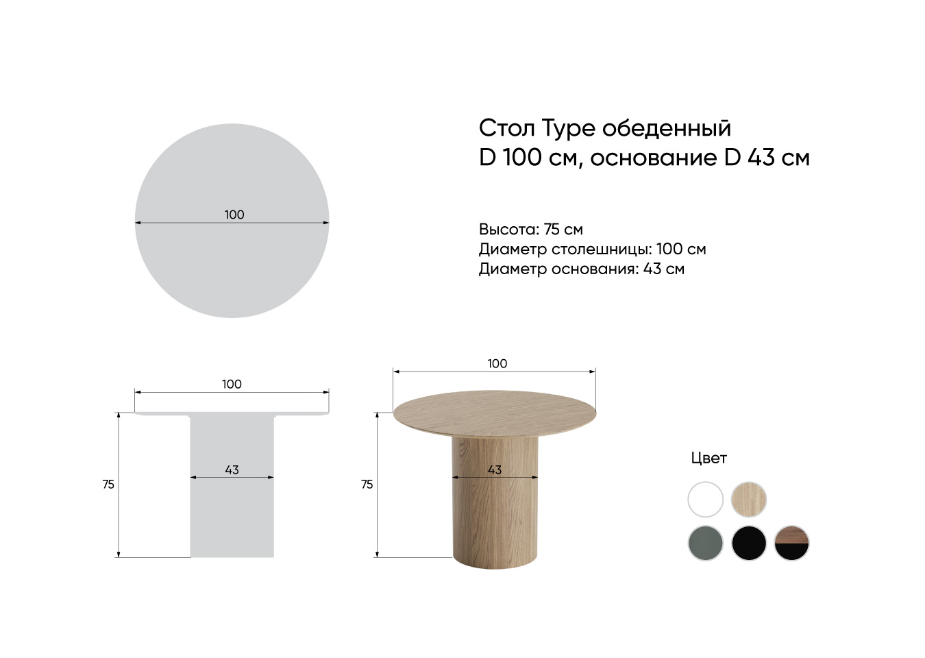 Высота: 75 см Диаметр столешницы: 100 см Диаметр основания: 43 см Вес: 64 кг Материал: массив березы, шпон дуба, мдф Покрытие: лак, черная морилка