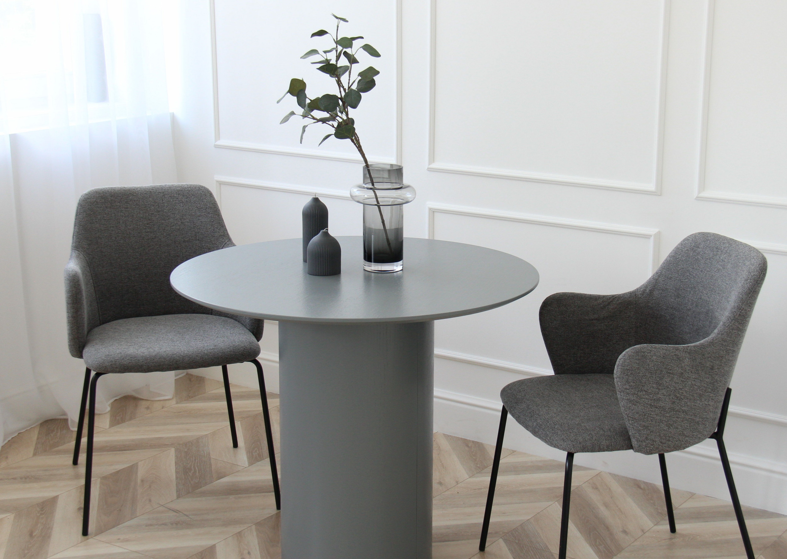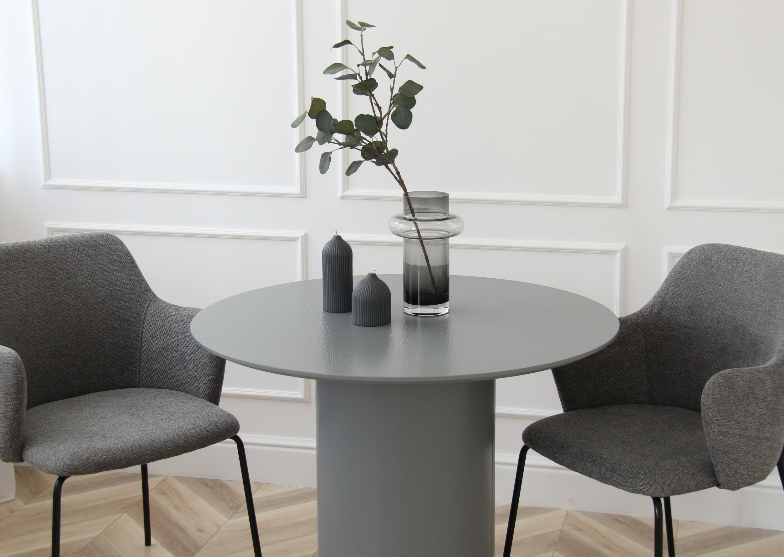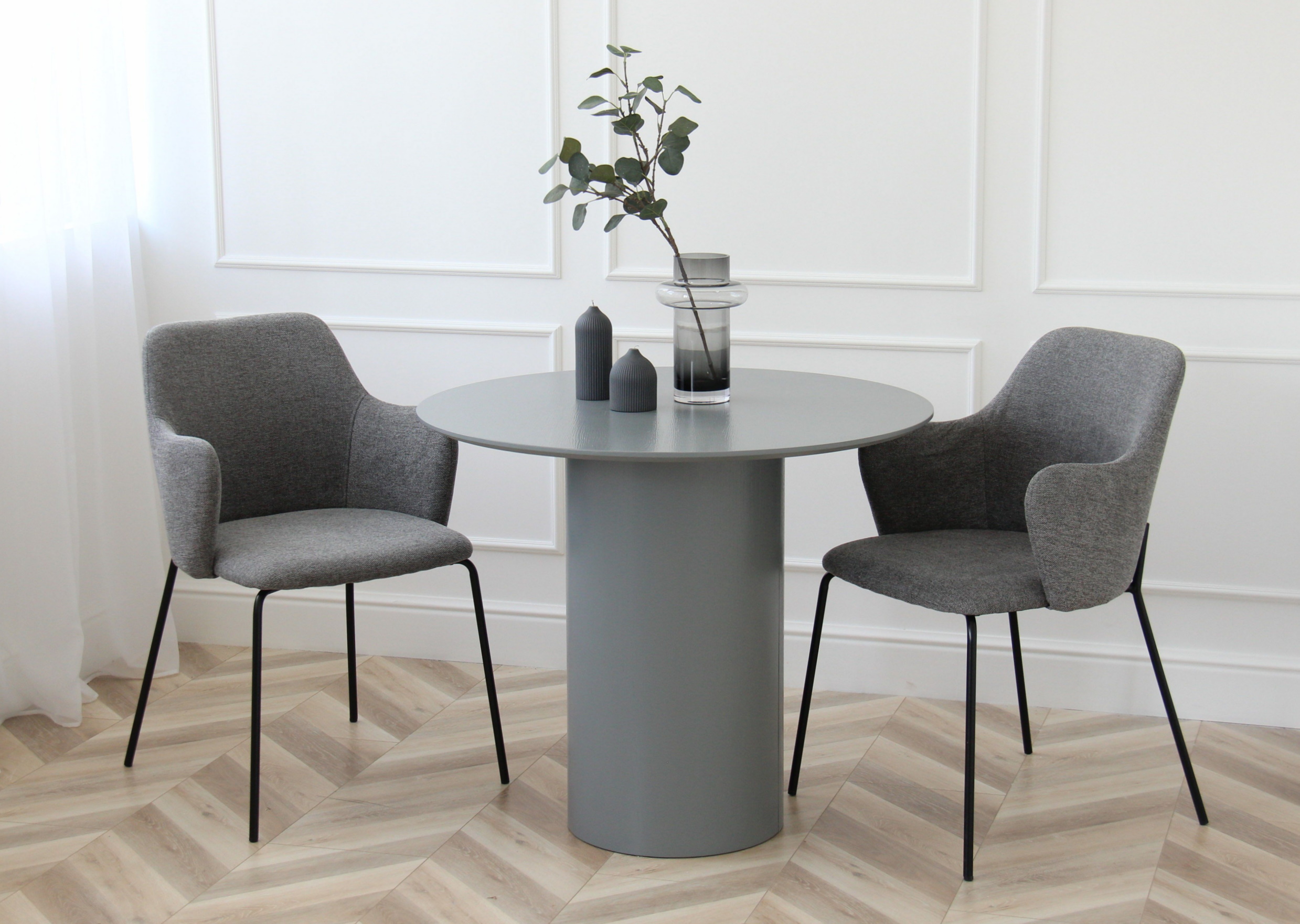 Высота: 75 см Диаметр столешницы: 90 см Диаметр основания: 39 см Вес: 49 кг Материал: массив березы, шпон дуба, мдф Покрытие: RAL 7037