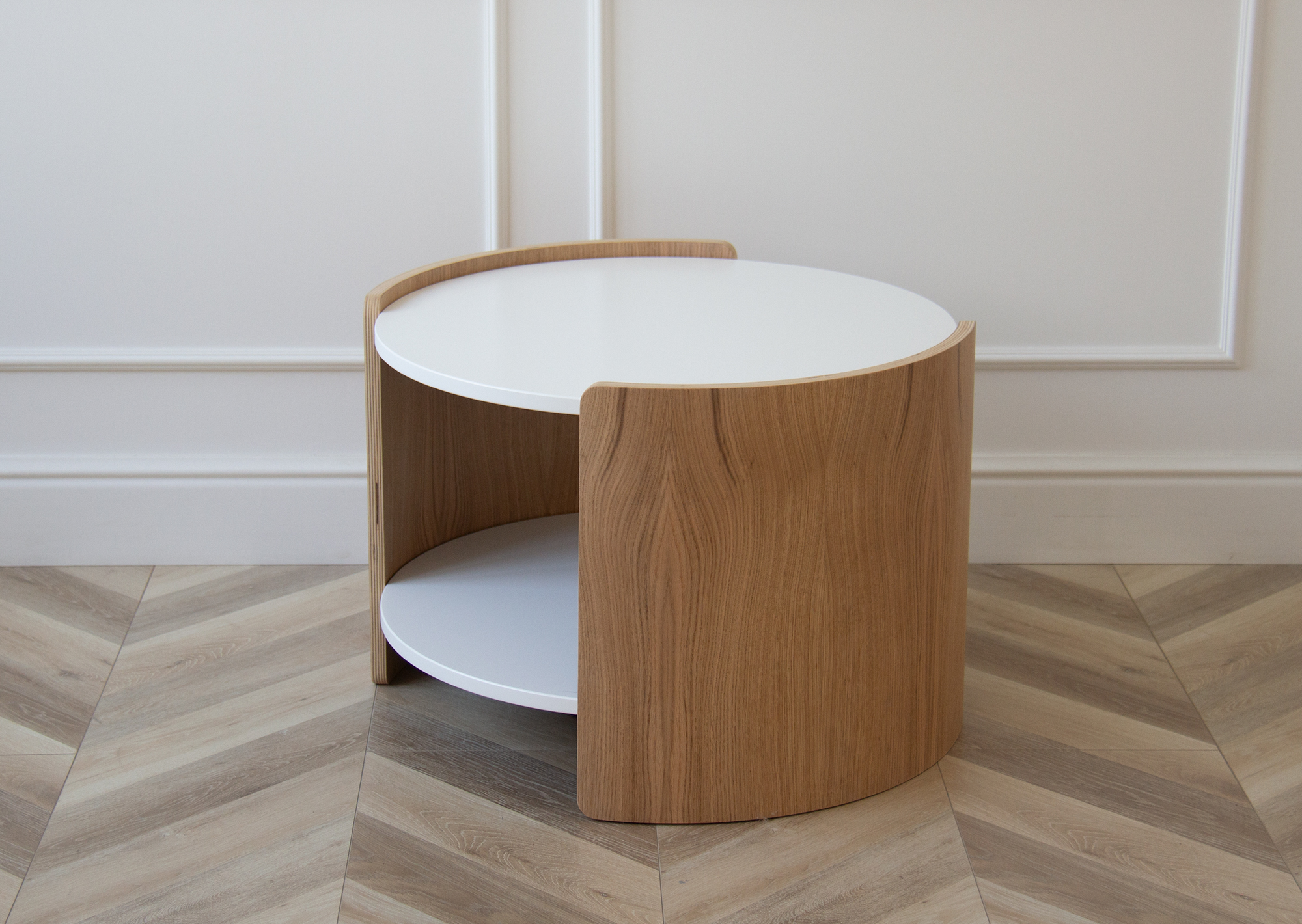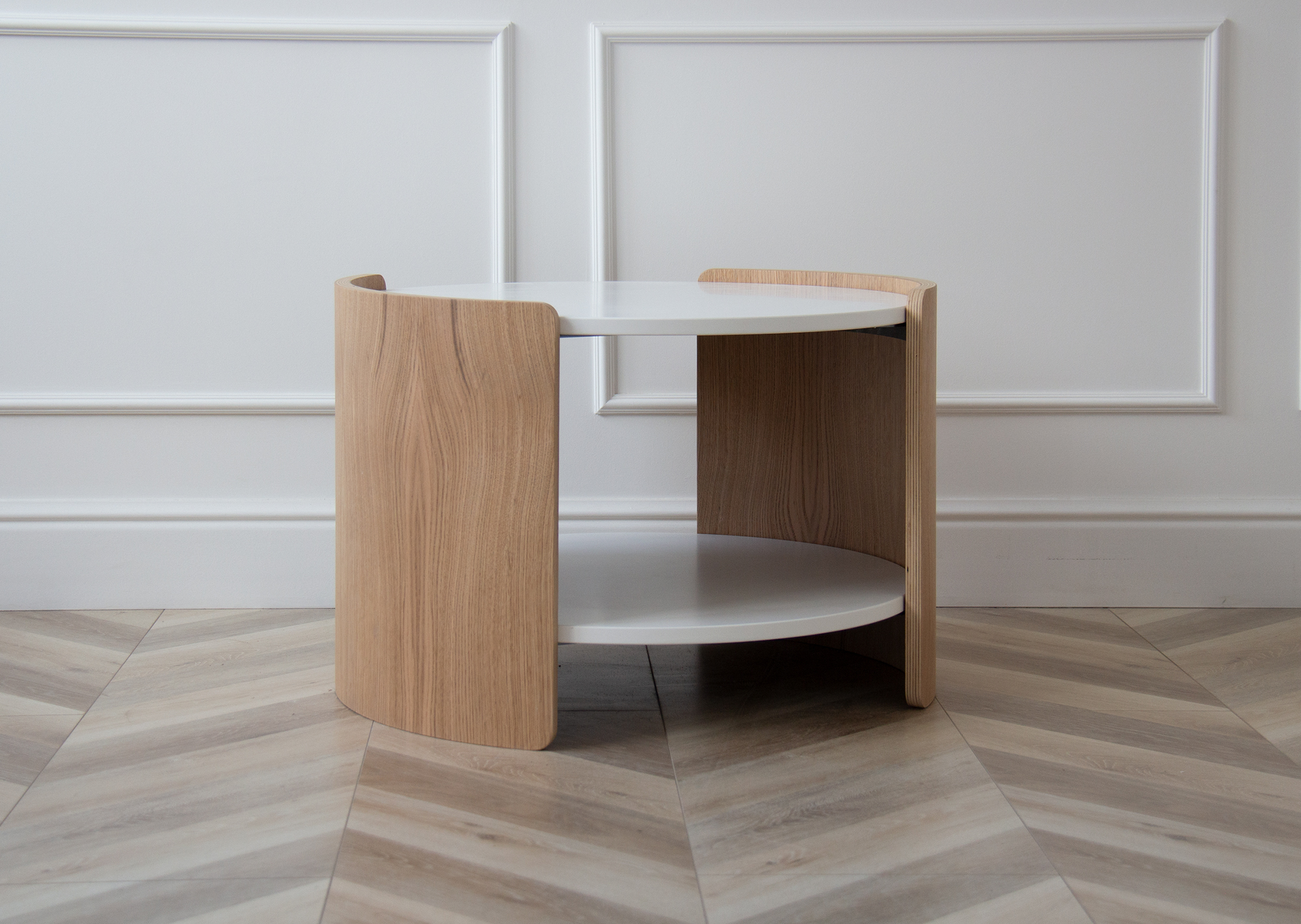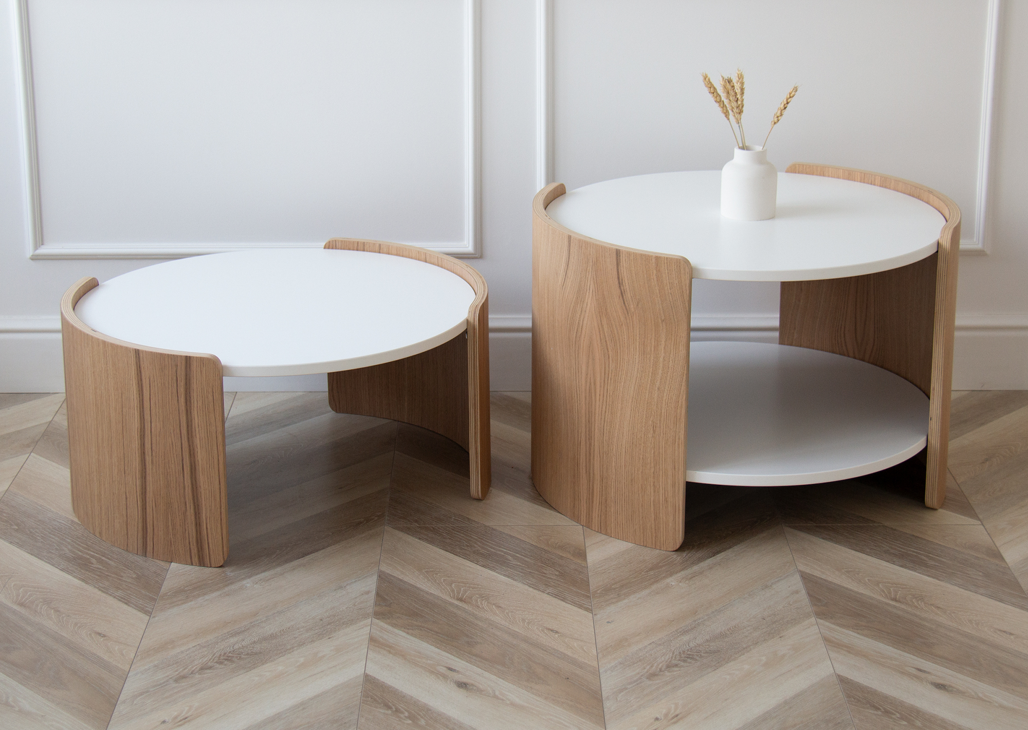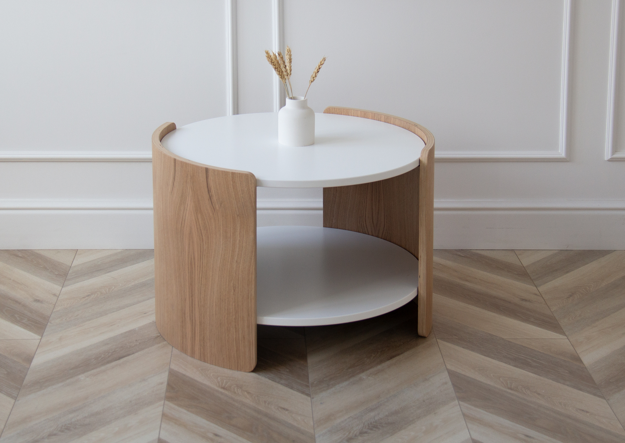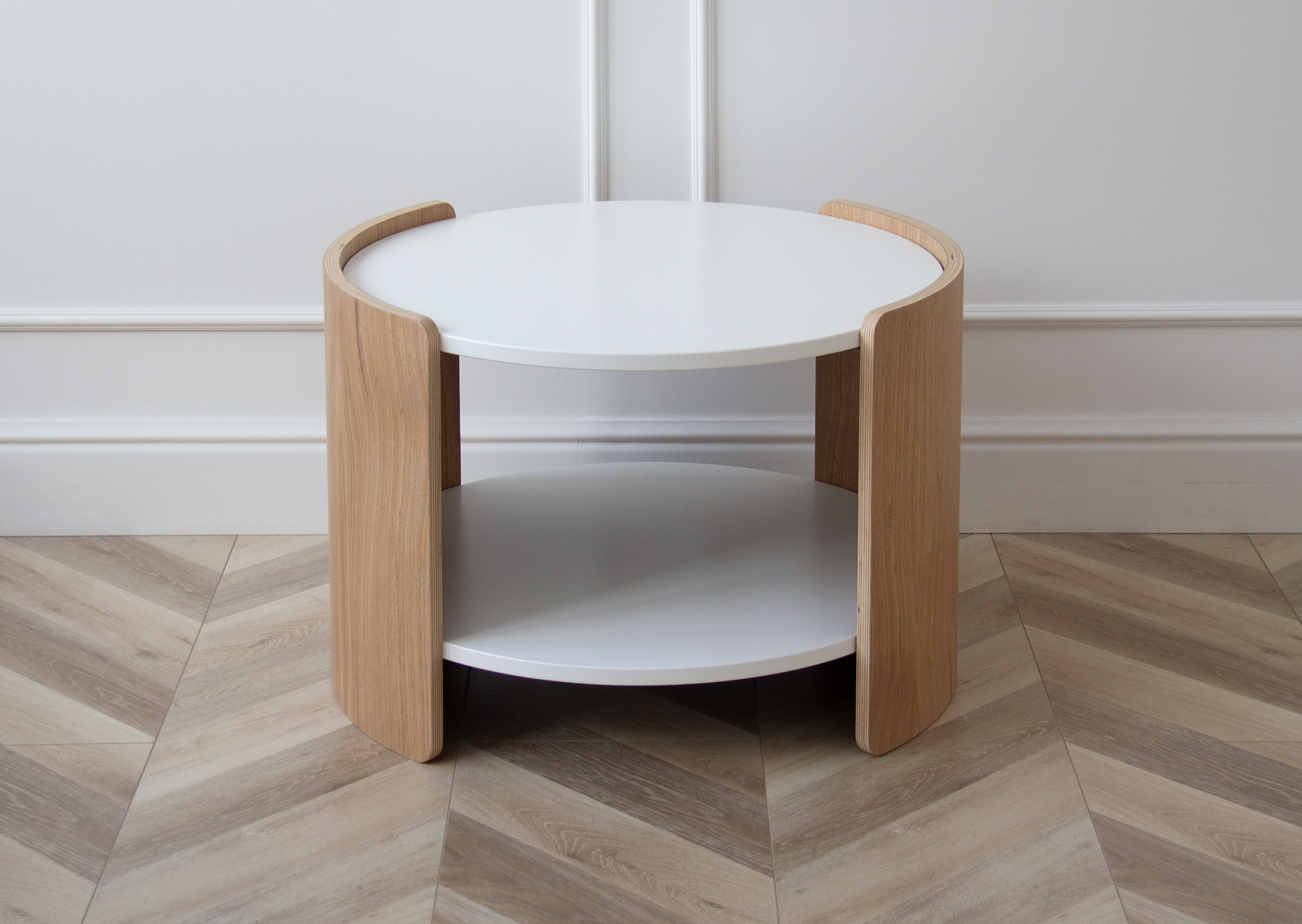 Оригинальные столики из коллекции Lagom станут ярким акцентом любой комнаты Можно организовать уютную зону в гостиной, использовать столики в качестве прикроватных или дополнить интерьер детской комнаты При производстве используется шпон натурального дуба, покрытие белый полупрозрачный лак, столешница под эмалью Высота: 45 см Диаметр столешницы: 62 см Диаметр основания: 65 см Основание: береза, шпон дуба, лак Столешница: МДФ 12 мм, эмаль RAL 9003