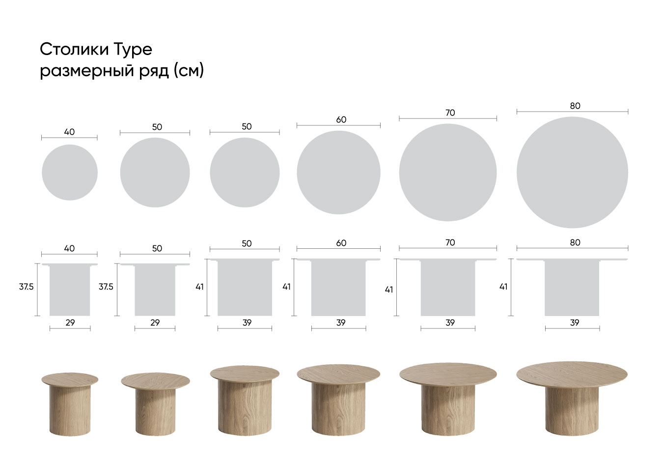 Оригинальные столики из коллекции Type станут стильным акцентом любой комнаты Благодаря широкому размерному ряду можно организовать уютную зону в гостиной, использовать столики в качестве прикроватных или дополнить интерьер детской комнаты При производстве используется шпон натурального дуба, покрытие белый полупрозрачный лак или эмаль Высота: 37,5 см Диаметр столешницы: 50 см Диаметр основания: 29 см Материал: шпон дуба, береза, мдф Покрытие: черная морилка + лак