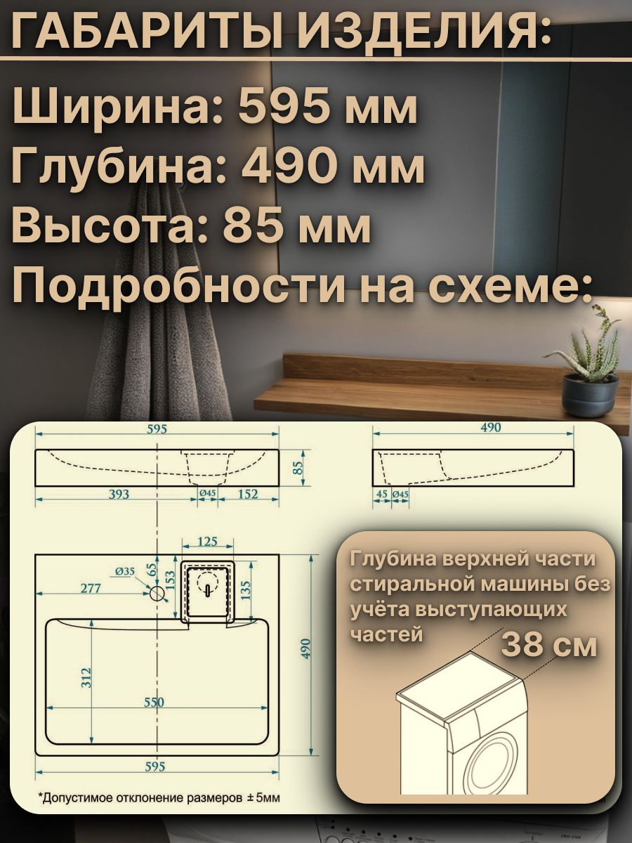 Размеры (ШхГхВ): 595х490х95мм. Максимальная глубина стиральной машины: 380 мм.