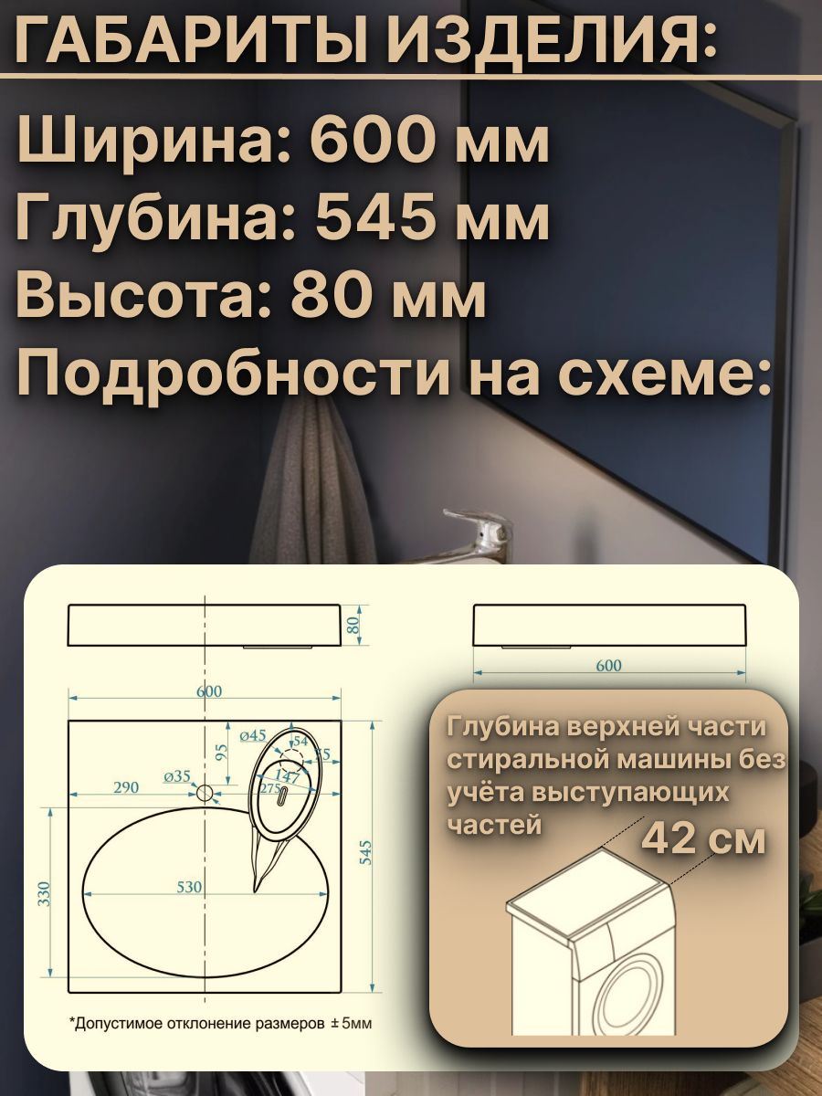 Размеры (ШхГхВ): 595х550х100мм. Максимальная глубина стиральной машины: 420 мм.
